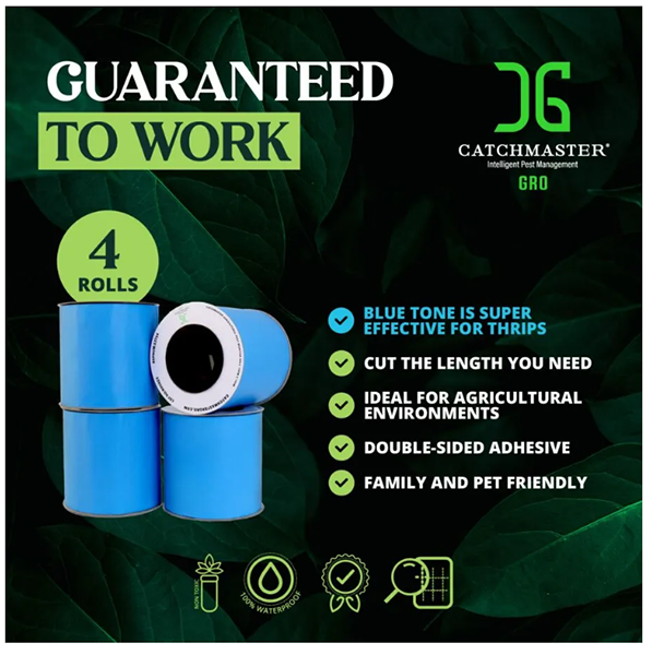 The 6" x 328' double-sided blue monitor tape from Catchmaster allows users to effectively monitor and manage insect populations in multiple zones of greenhouses and indoor cultivation facilities.
