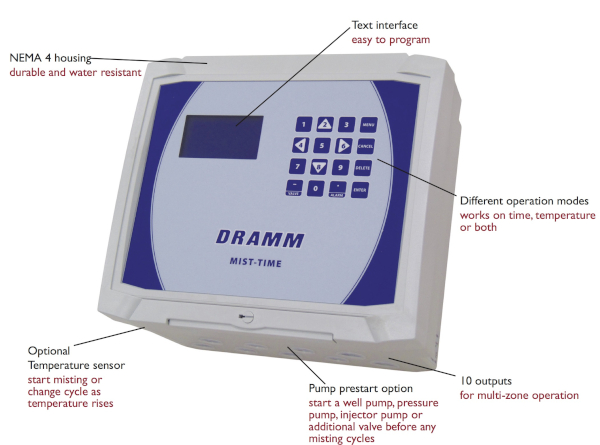 The Dramm MistTime Controller is perfect for time or temperature based control of misting valves. With the ability to program each valve independently, the MistTime offers unmatched flexibility. Each valve is operated on a cycle. The timing is variable with the duration operating between 1 second and 60 minutes and the interval time operating between 1 minute and 12 hours.