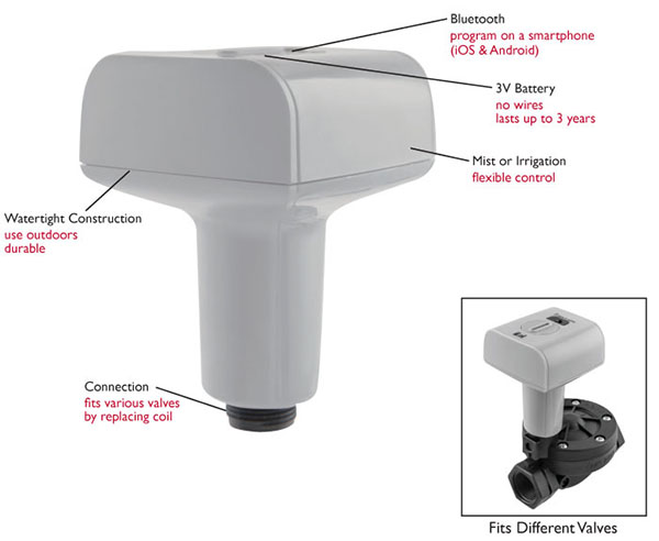 The ii ri Smart Controller is a a battery operated, Bluetooth Connected, irrigation/misting controller that can operate one solenoid valve without wiring.