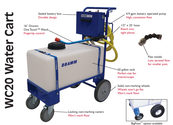 The Dramm Battery operated watering cart features a rechargeable battery that can pump up to 300 gallons before charging. It has non-marking wheels and casters and has a 4 gpm output. This product is available on a special order basis.