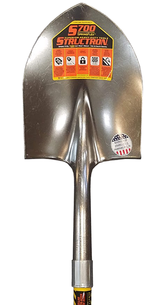 The Structron round point shovel features a 14 gauge tempered #2 head, with a forward turned step. It has a 48” fiberglass handle with cushion grip, and PowerCore™ solid fiberglass reinforcing rod.