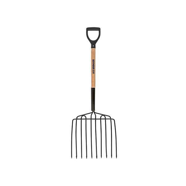 The Seymour ensilage fork features a 10 tine head and a 30” hardwood handle with poly d-grip.