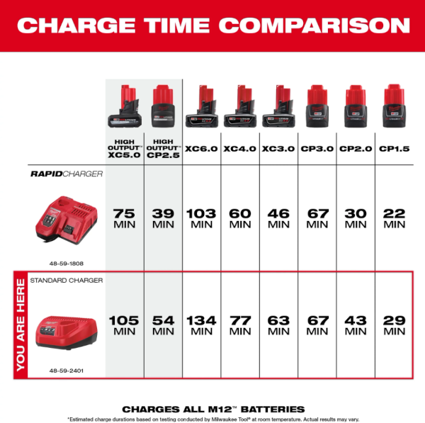 The M12 Lithium-ion Battery Charger from Milwaukee Tool can charge M-12 batteries in less than an hour. The battery charges are easy to monitor thanks to the onboard indicator light.