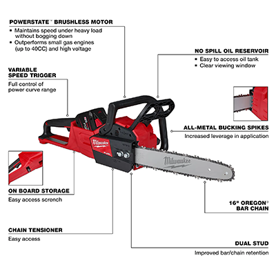 - POWERSTATE™ Brushless Motor: Purposely built for the M18 FUEL™ 16" Chainsaw to provide the power and performance of a gas engine up to 40CC