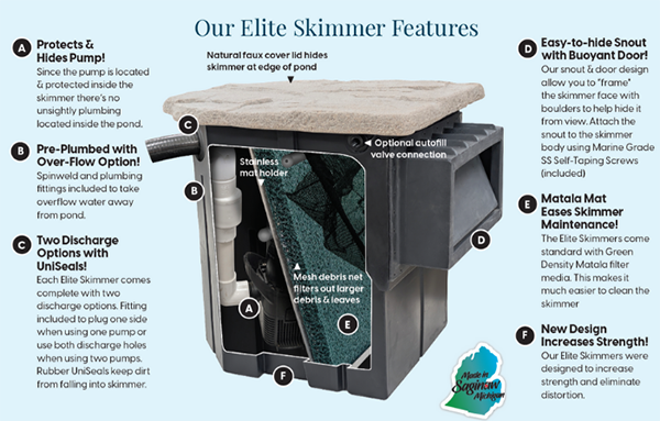The 10” Elite Skimmer box comes with a natural cover lid that protects and hides the pump. It is plumbed with over-flow spinweld elbow, and has two discharge options with UniSeals®. Matala® Mat eases skimmer maintenance and the stronger mesh net lasts longer.