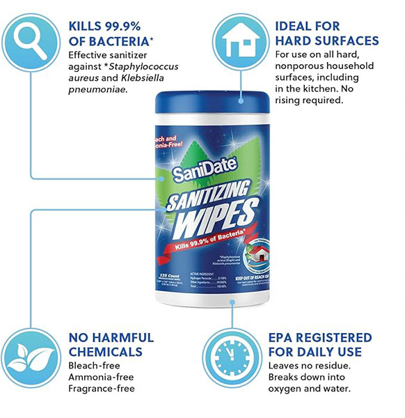 SaniDate Sanitizing Wipes are single-use wipes for quick sanitation of hard surfaces and cleaning of egg shells. This activated peroxide sanitizer is ideal for use in processing facilities, is easy to use and store and can be handled without PPE.