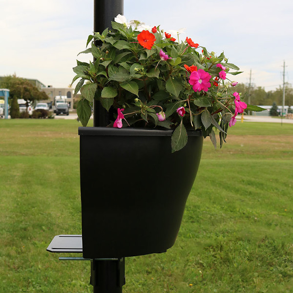 Get a 360 degree view with a wrap around planter. The 28” Wrap Around is a perfect solution for cities that wish to beautify their light poles and banner posts with an eye-catching view. With the built-in reservoir cities can conserve water and reduce labor costs. The Wrap Around fits poles 3.5” to 8” in diameter. The design makes this container functional as a window box or adaptable for a bridge hanger as well.