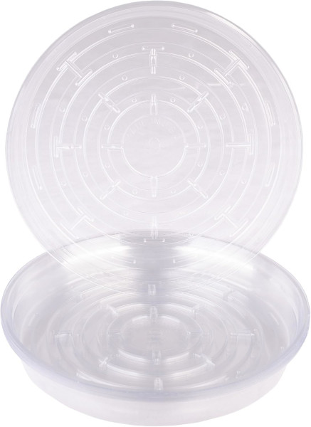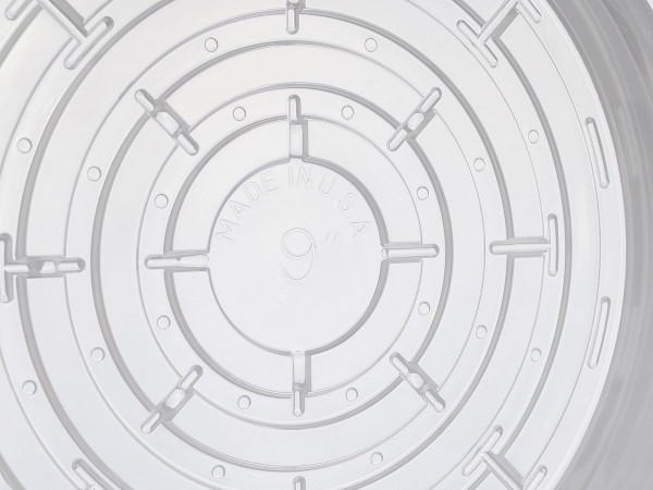 Each saucer has an airflow bottom design that does not trap moisture, dirt, etc. under the saucer. Saucers de-nest easily. They will not stick together and are available in a variety of sizes.
