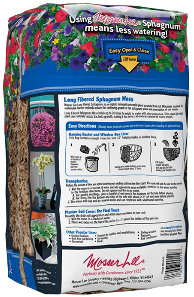 Long-fibered sphagnum moss is not peat moss, but rather a perennial plant that grows wild in the Central Wisconsin sphagnum bogs. Mosser Lee's sphagnum is a renewable resource growing back in the same bogs every 5-7 years, so using Mosser Lee's long-fibered sphagnum does not destroy our precious wet lands.