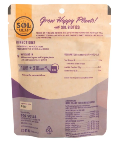 Sol® Soils Monthly Myco Biotics contains four species of Mycorrhizae, which are beneficial fungi for plants. They also increase the surface area of root systems, making it easier for them to absorb water and nutrients. The four species of Mycorrhizal fungi are Rhizophagus intraradices, Septoglomus deserticola, Claroideoglomus etunicatum, and Rhizophagus clarus.