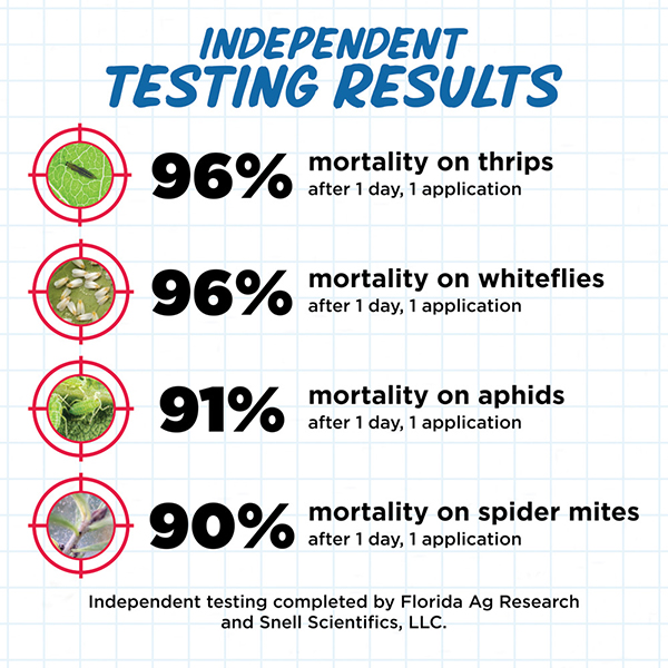- Natural insecticide, miticide and repellant for vegetables, fruits, ornamentals, and houseplants