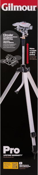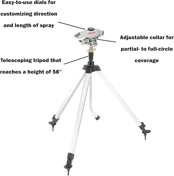 The Gilmour far-reaching sprinkler spray and durable construction make this the go-to sprinkler for the pros. With a telescoping tripod that reaches a height of 58 in., extended coverage area (up to 8,500 square feet) is ideal for extra large areas of grass. The all-metal build stands up to frequent useāeven in tough conditions while the spiked feet provide maximum stability in grass. Lifetime Warranty.