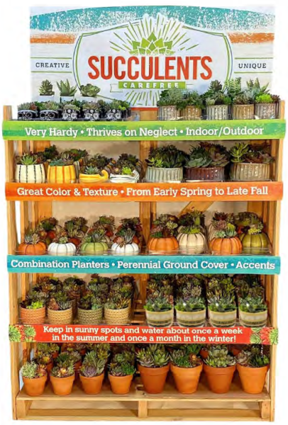 A five-tiered rack containing a variety of succulents in fall themed planters. 180 pieces.